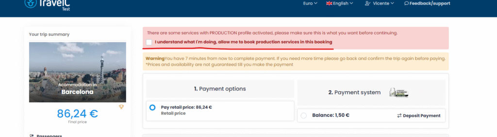 Las reservas que se hagan en microsites de tipo tests (o en preproducción) y el proveedor configurado como producción darán un book error. Si se quiere testear un proveedor de producción en esos microsites o en pre, saldrá una alerta en la pantalla de pago que tendréis que aceptar para que no dé un book error.