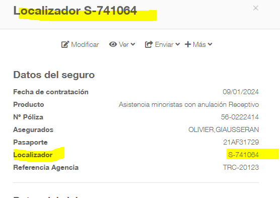 Procederemos a sacar el seguro. Al finalizar obtendremos un localizador que es el que deberemos insertar en la reserva
