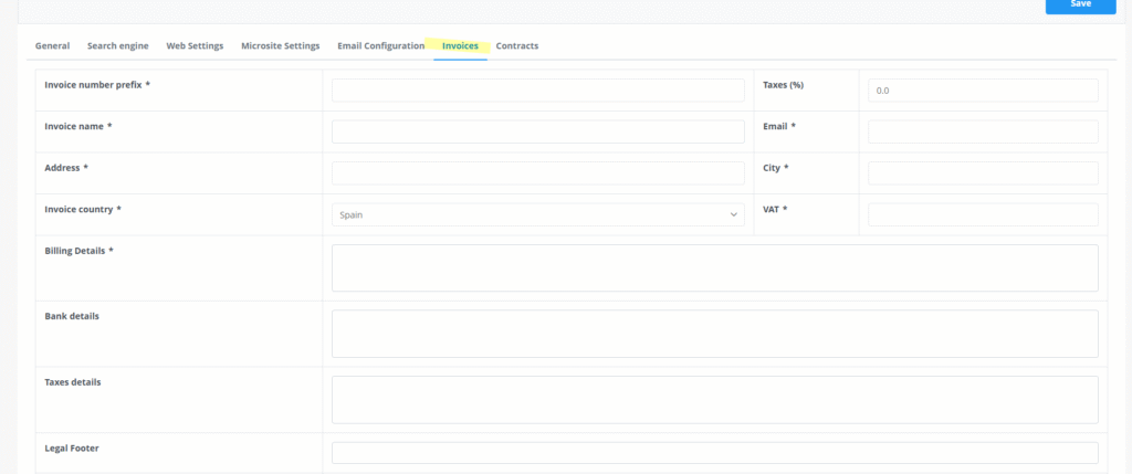 La configuración de esta factura se debe de realizar desde Microsites > Microsite Settings en la pestaña de Invoices