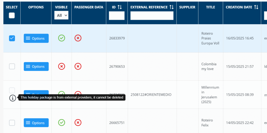 La selección masiva sólo permite eliminar Holiday packages pero hay que tener en cuenta que el botón DELETE no estará habilitado para aquellos Holiday Packages que tengan reservas vinculadas.