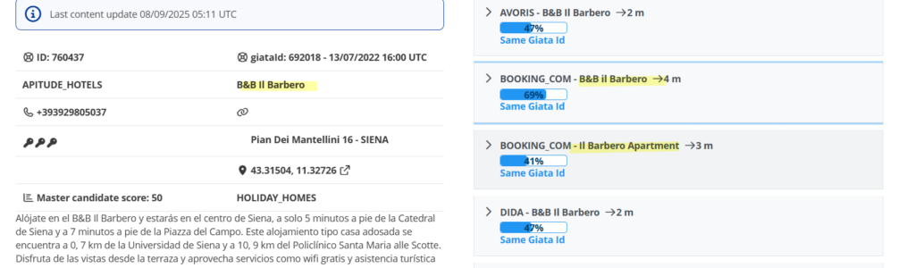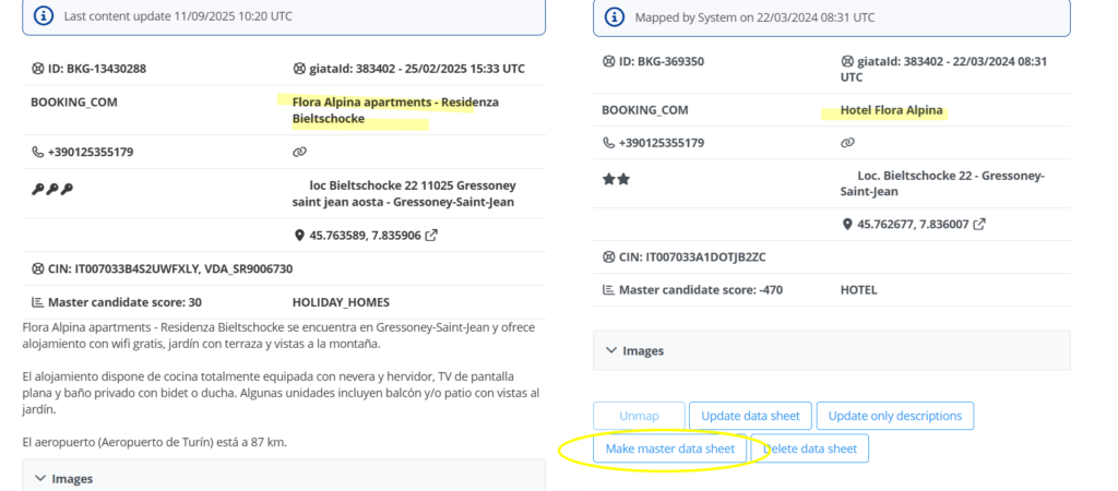 - Comparar la ficha master con la ficha del proveedor (Nombre, dirección, geolocalización, imágenes, etc.), si los nombres son diferentes y si no parecen ser la misma propiedad…Podemos encontrarnos que el proveedor tiene 2 fichas diferentes (actualizar)