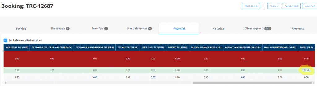 ¿Porqué el operator fee? Tenemos una clausula en las condiciones al hacer la reserva, que si la cancelación de la misma no es por fuerza mayor, los gastos de gestión son de 30€ por persona, como en este caso sólo es un transfer y el cliente nos debería de pagar, sólo le quitamos el Operator fee. Desglosaremos los importes al cliente para informar de ello correctamente: