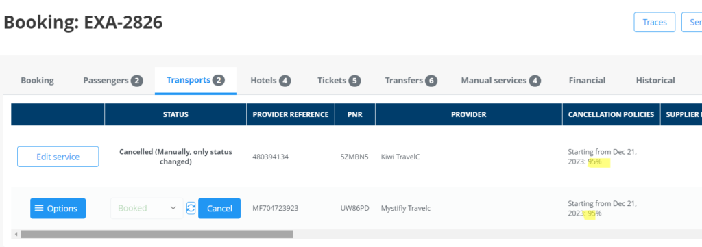 Esto que implica que si lo tienen activo, los servicios con transporte que son NO reembolsables, en la reserva aparezcan un porcentaje diferente al 100%, ya que los el Agency Management Fee es reembolsable. Reserva de ejemplo: EXA-2626