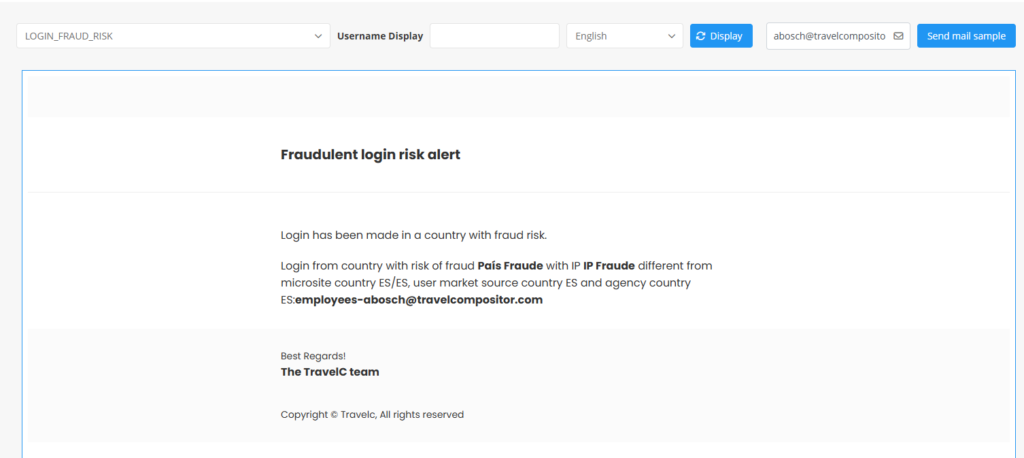 Alerta de riesgo de inicio de sesión fraudulento se ha realizado un desarrollo en el que si se crea un usuario que no pertenece al source market del microsite o del operador y que además tenga marcado ese país de riesgo (país de riesgo que hayan puesto todos los operadores, no solo ese operador en concreto), se enviará un email al operador (email OPERATOR) informando de ello, esto no significa que no se haya activado el usuario, simplemente un aviso de que podría ser fraude.