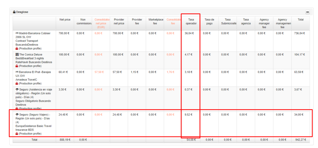 - Agency Fee: importe total del agency fee 1.35 / importe total de la reserva 529.12 = 0.0025 = 0.25%