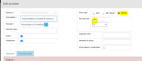 Aquí lo que hace el sistema es netear el precios que nos envíe europasistante. Es decir que si envia 200 euros le va a restar 56 euros. Esto lo usaremos si el operador nos pide que no quiere reflejar la comisión del 28 % que europasistence les da en el sistema. Con esta modalidad este proveedor si que aparece en operator fees para que le cargue lo que quiere ganar.