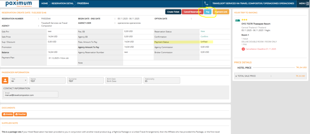 Después de haber confirmado la reserva veremos que el pago esta Unpaid pero haremos caso omiso, simplemente que a nivel financiero aun no esta pagada.
