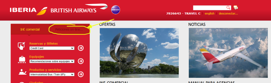 Para recuperar servicios con la aerolínea Iberia, tendremos que loguearnos (claves en el Vaultwarden), una vez dentro ir a Peticiones on-line