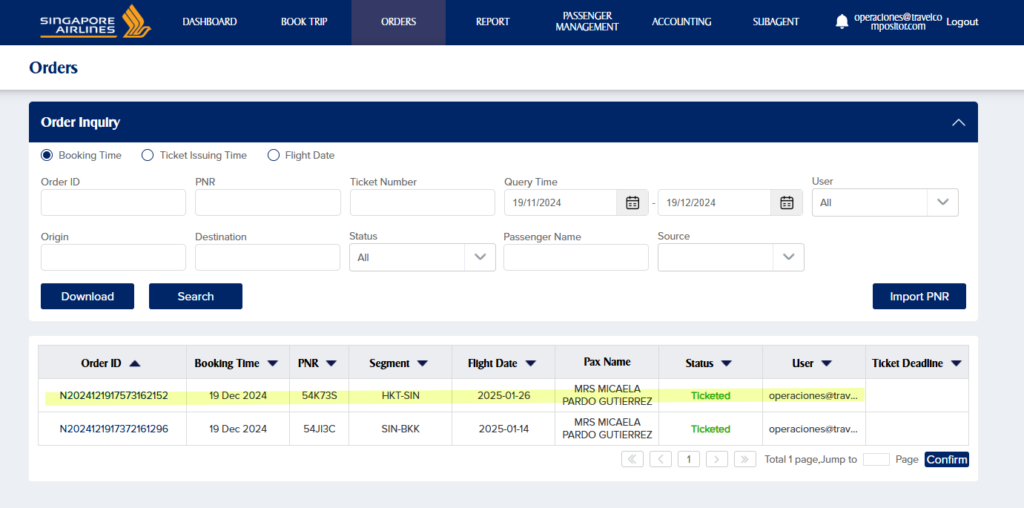 Nota importante: En nuestro sistema, no podemos darle al refresh (NO TOQUE LI BOTONE) a esta conexión porque no reflejará el servicio como toca, Orchestra tiene un problema que si se realizan cambios directamente con la aerolínea, su sistema no lo reconoce y hace que el estado de la reserva en su sistema quede diferente al BOOKED, es por ello que siempre contactaremos con la aerolínea para corroborar el estado del servicio y actualizaremos en nuestro sistema como per toque.