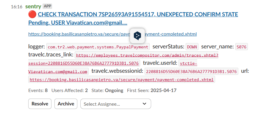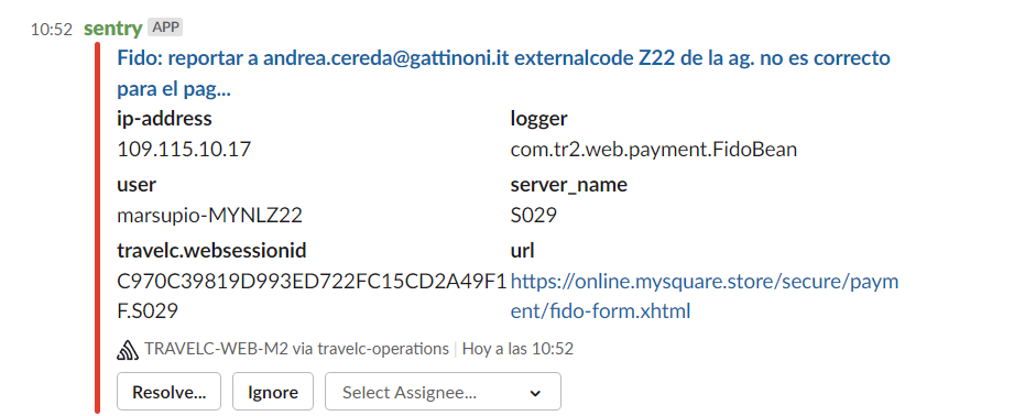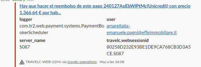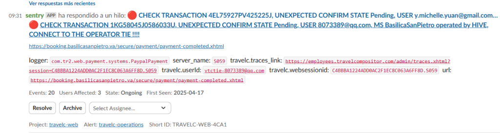 En el caso que no haya reserva, informaremos al OP (plantilla “Error en el proceso de pago (SENTRY)” ) facilitando el order number de la transacción, buscar el purchase attempt por si quieren confirmar la reserva manualmente y facilitar el usuario implicado. Es procedimiento interno de cada operador de como proceder ante estos casos, si quiere confirmar la reserva manualmente o si prefiere reembolsar para que el cliente realice la reserva nuevamente.