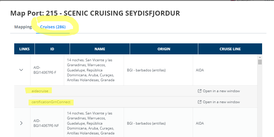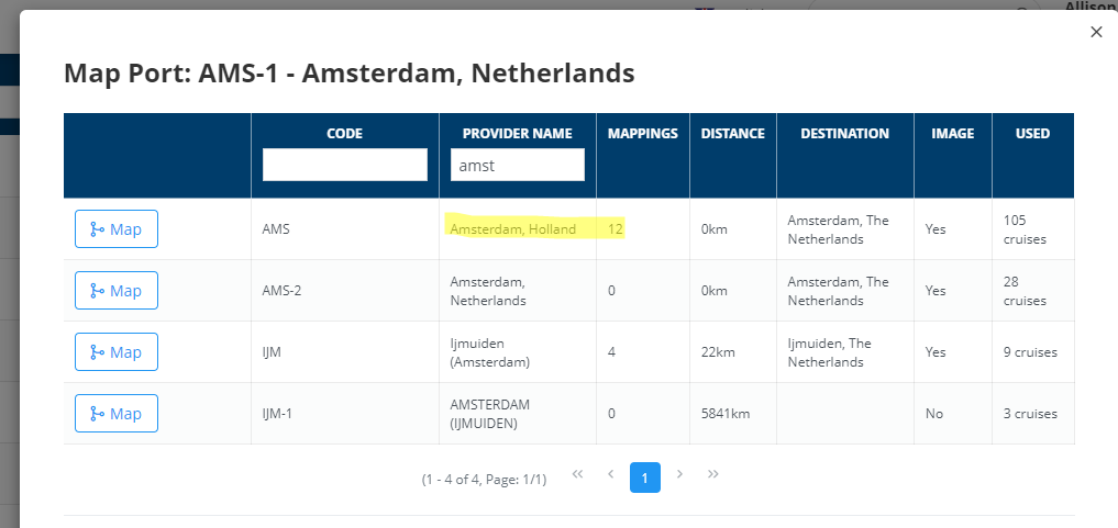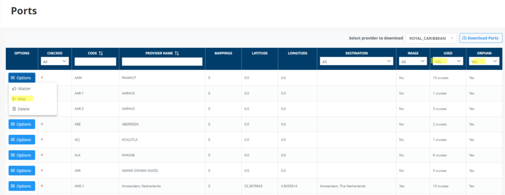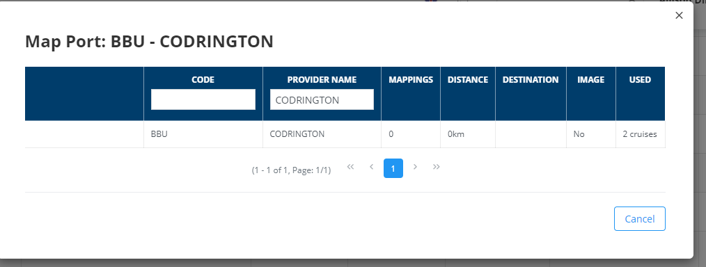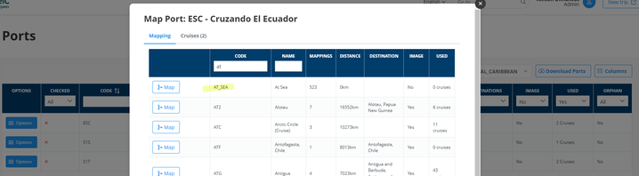 NOTA: La pantalla ports es en realidad son cruise stops, hay compañias que nos pasan nombres de paradas, un ejemplo fue CRETA,es una isla con varios puertos, no sabemos en que puerto para el crucero, lo mapeamos a Chania. Pero se ha decidido modificarlo y mapearlo al puerto mas grande Heraklion. Si nos encontramos con estos casos hay que estudiarlo y verlo bien, ver como lo mapea Logitravel, por ejemplo, o valorar incluso crear un puerto “ficticio” que sea Creta.