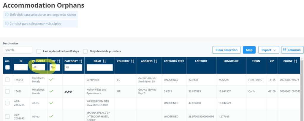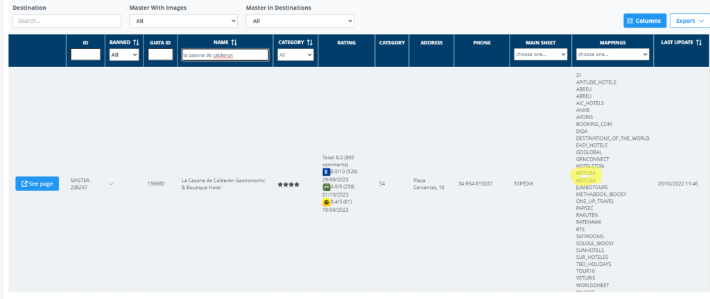 En Accommodation Orphans, filtrar por el proveedor Hotetec y mapear todas las fichas, si no hubiese ficha master, podemos hacerla master siempre que tenga toda la información completa, imágenes, descripción y dirección. Si no encontramos la ficha es posible que haya sido baneado automáticamente por el sistema después de haber saltado el aviso en el sentry, informar a Sandra para que lo revisen.