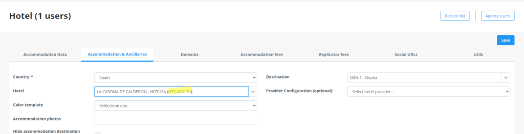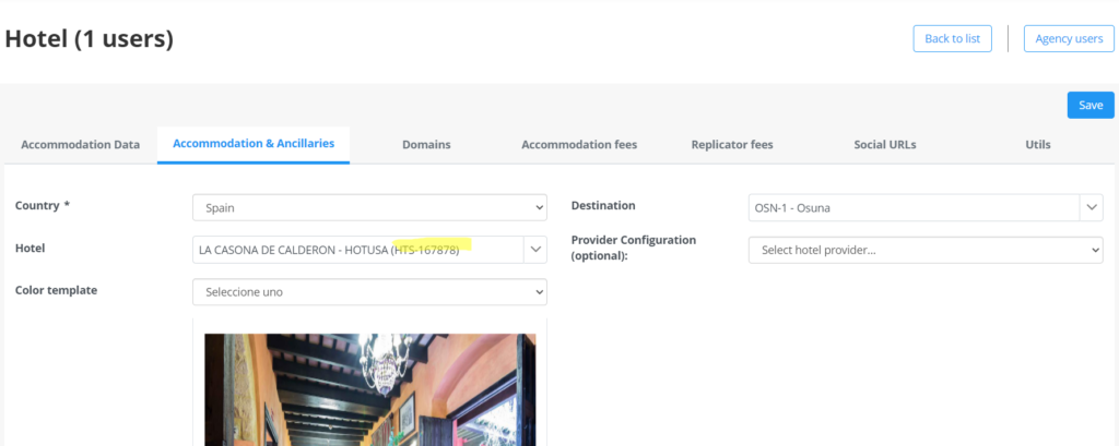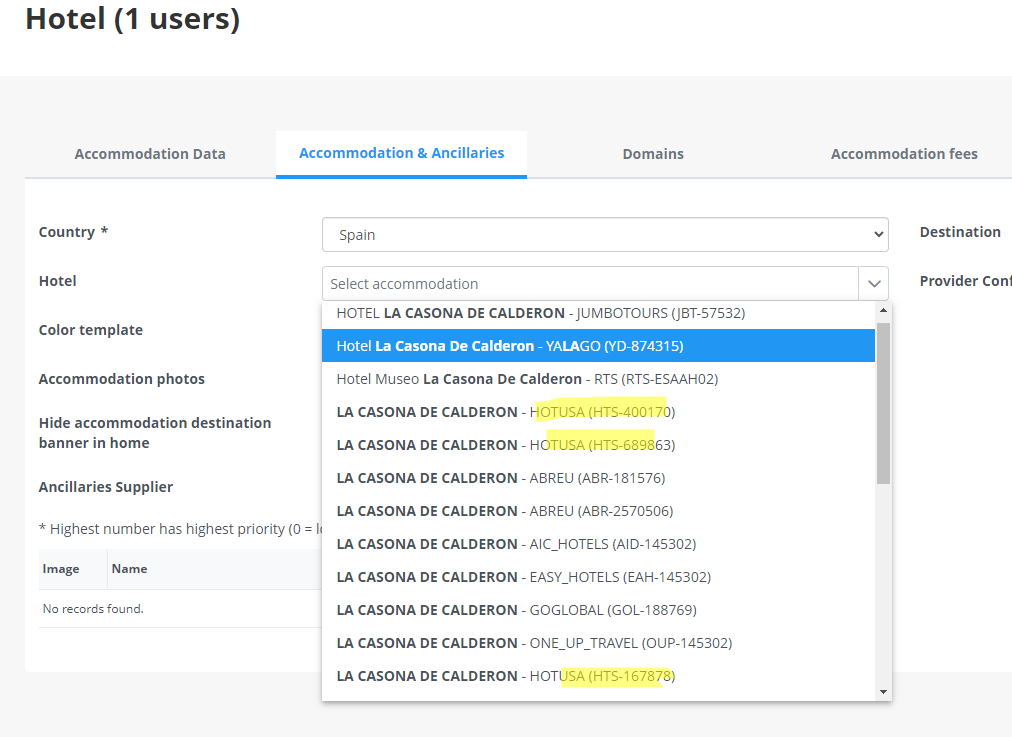 2º Filtraremos por el nombre del hotel, en este caso LA CASONA DE CALDERON, en la pestaña de Accommodation & Ancilliaries podremos ver que han puesto una ficha de hotel