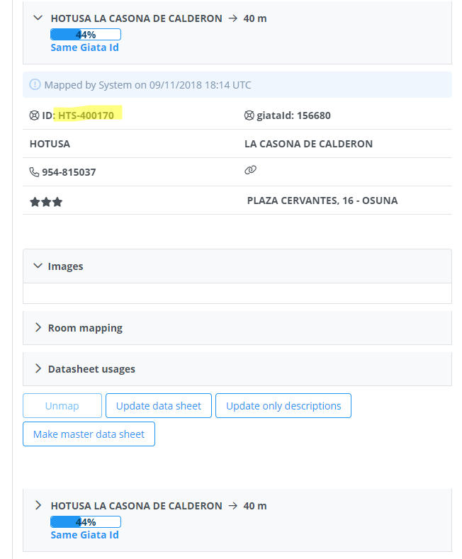 Verificaremos que tengan Giata ID, cualquiera que lo tenga, podemos vincular dicha ficha al hotel del punto 2, en este caso ambos tienen giata id, así que cualquier valdría para configurar en la ficha del hotel.