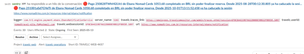• 2 sentry’s parecidos –> Hay que hacer el reembolso de este pago // CHECK TRANSACTION 7SP26593A91554517, UNEXPECTED CONFIRM STATE Pending, USER… // Pago 251001aSd7GYelTr de Ebanx Nomad Cards 1058.68 completado en BRL sin poder finalizar reserva. Desde 2025-10-01T13:11:52.658 ya ha caducado la sesión