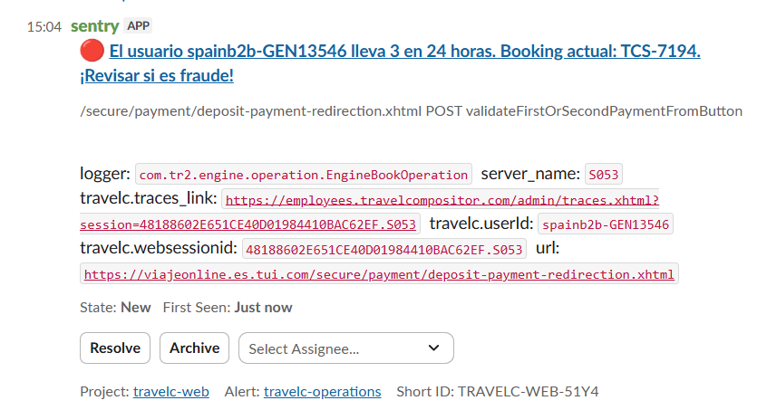 • El usuario spainb2b-GEN13546 lleva 3 en 24 horas. Booking actual: TCS-7194. ¡Revisar si es fraude!
