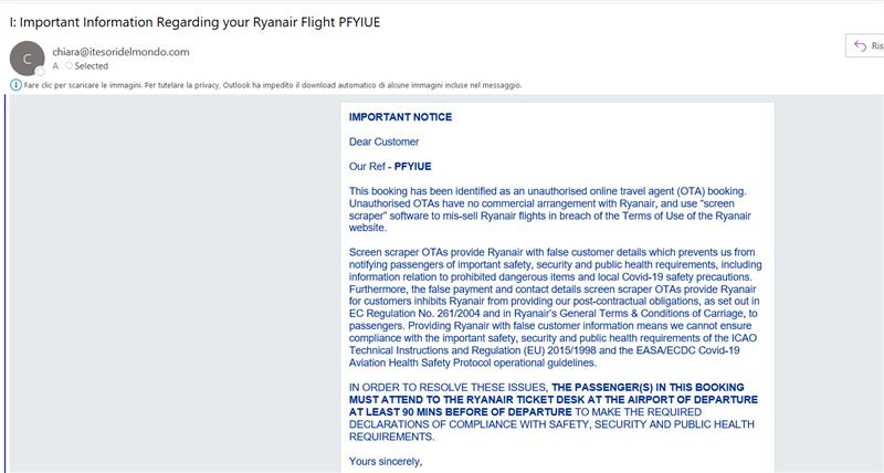 Like you may know Ryanair has launched a campaing against travel agencies, otas etc to stop selling their flights. Since a few weeks they are sending these emails to the email included in the booking created with them.