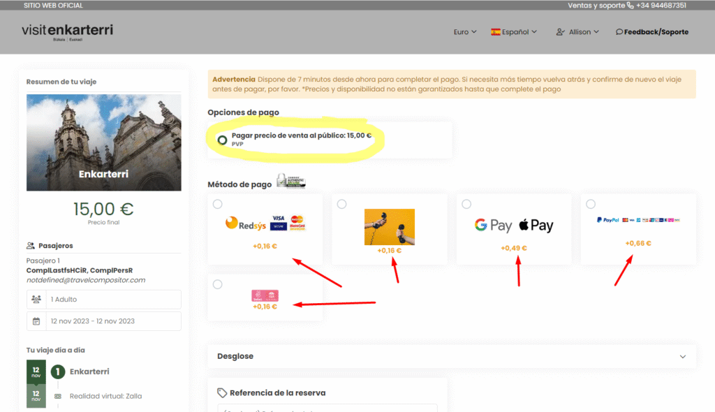 Hay que tener en cuenta que este cliente quiere que se muestren los importes netos + operator fee (5%) en todo el proceso de reserva y que al llegar a la pestaña de pago, el cliente sea quien decida que pasarela añadir junto con el fee correspondiente.